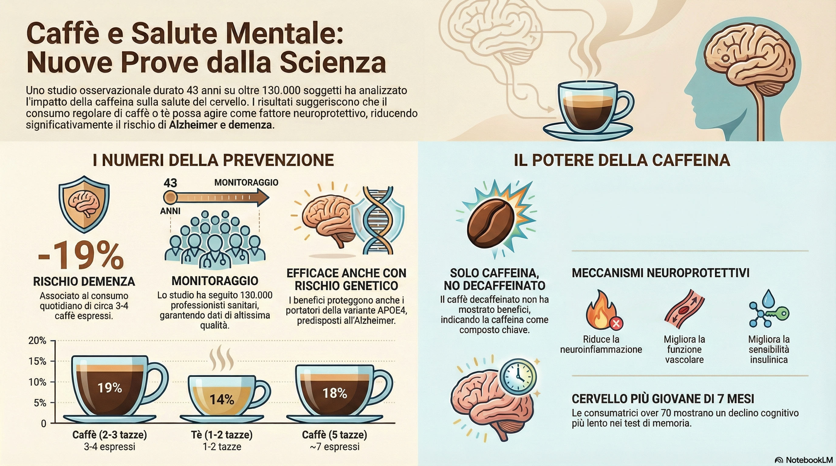 Il recente studio su larga scala Coffee and Tea Intake, Dementia Risk, and Cognitive Function, primo autore Yu Zhang e pubblicato su JAMA, indica che la caffeina potrebbe offrire una protezione cerebrale, ma resta solo un elemento nel mosaico della prevenzione, non una soluzione miracolosa[1][2].